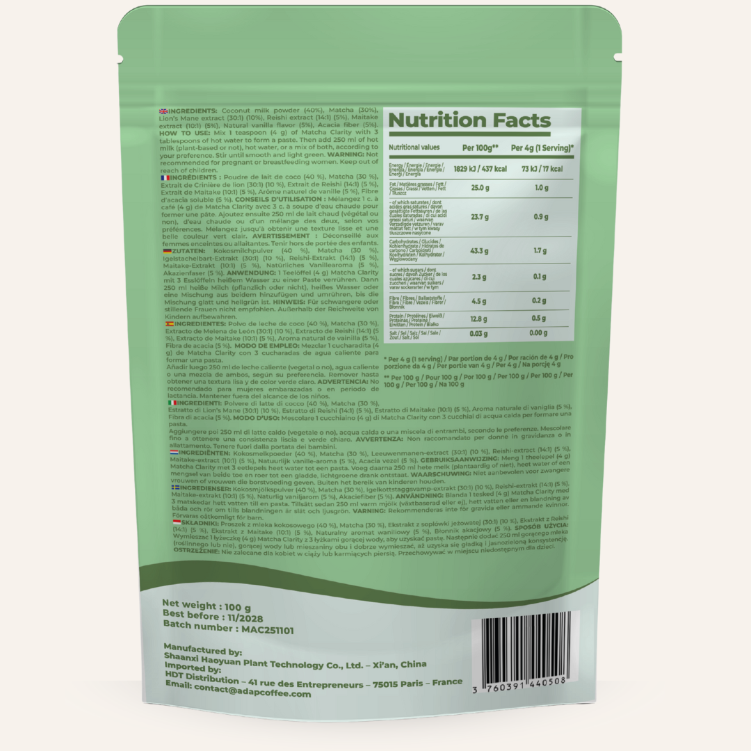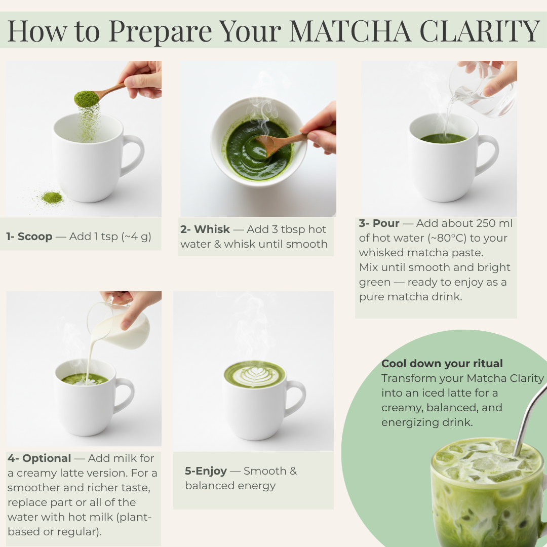 Add 1 heaping spoonful (~4g) to your cup. Pour 250 to 300ml of hot or cold water – it's also delicious as an iced version. Simply mix with a spoon or use a milk frother for an even creamier texture. Enjoy as is, or add milk (plant-based or not) and a touch of honey, agave syrup, or stevia. One cup a day is enough to make Clarity Cup your favorite wellness ritual.