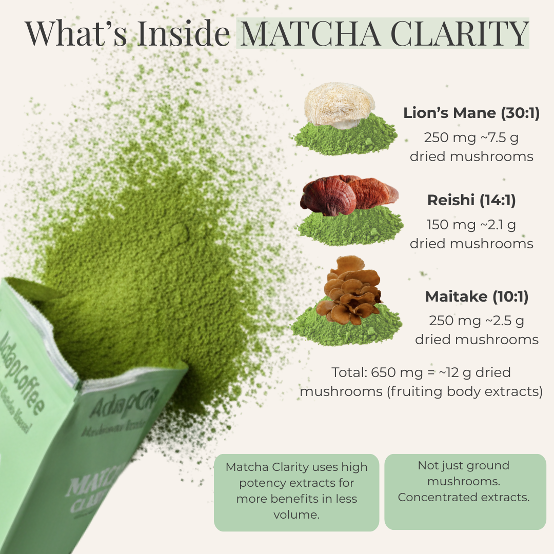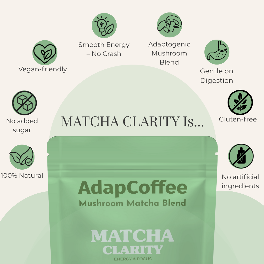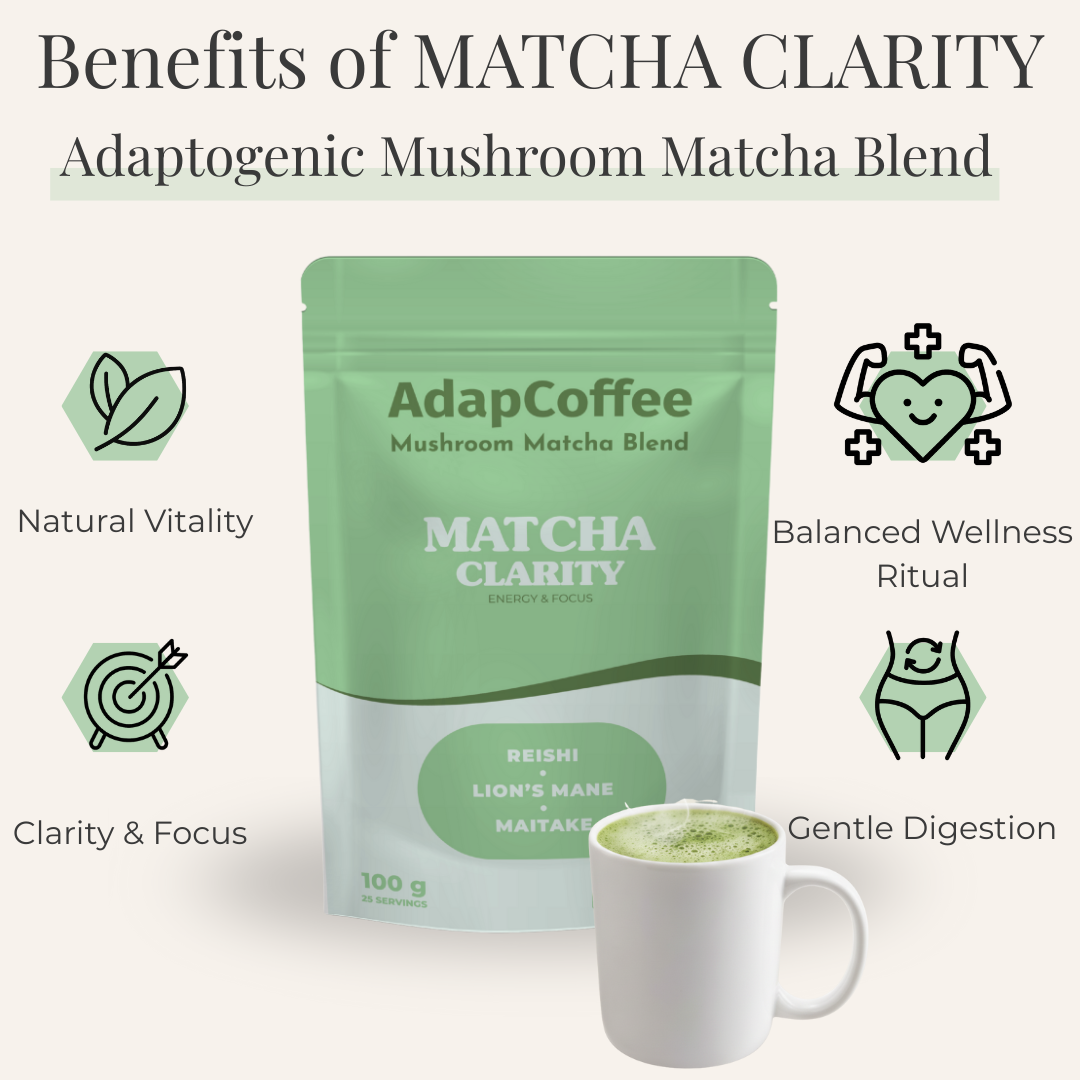Thanks to its ceremonial matcha and adaptogenic mushroom extracts, Matcha Clarity by AdapCoffee:
