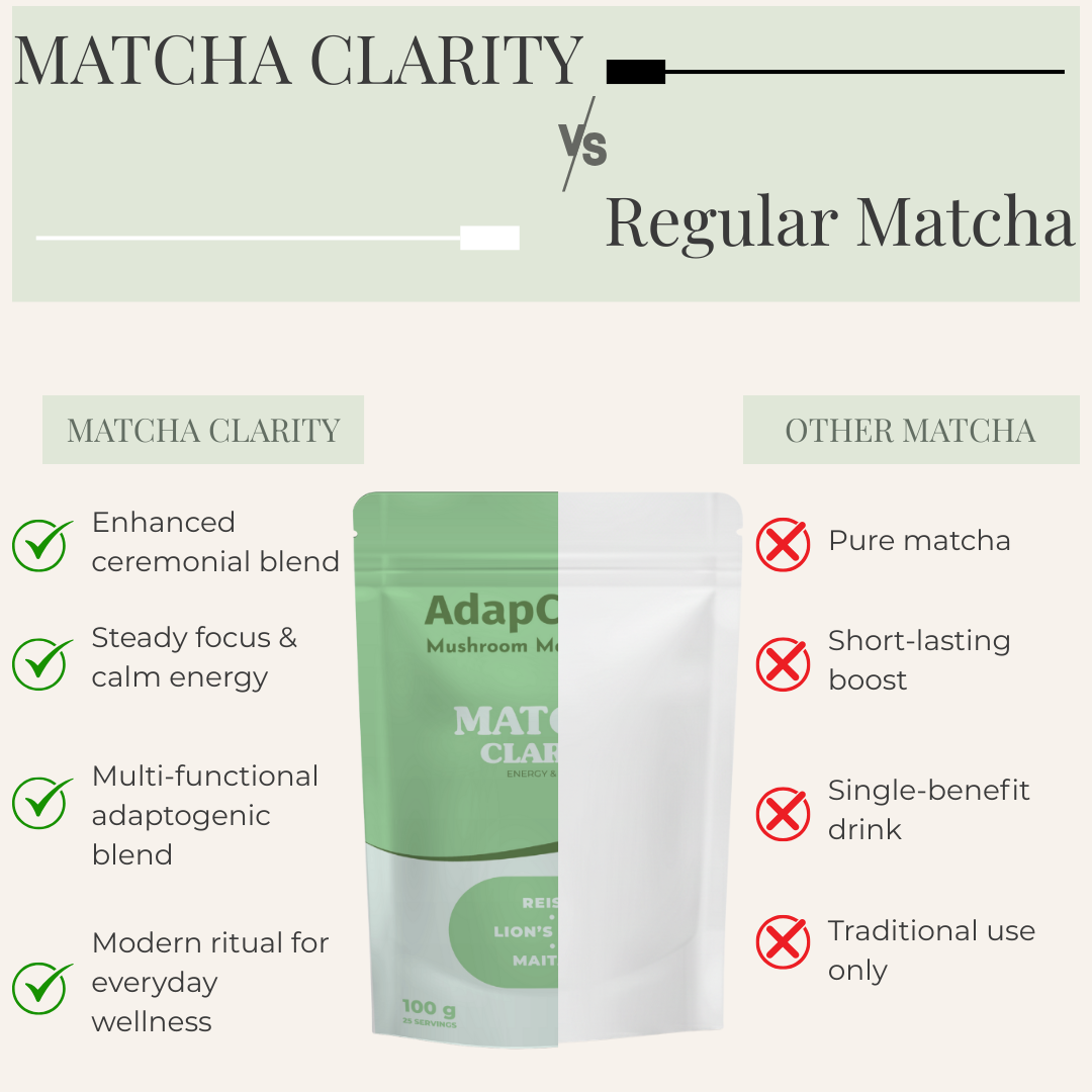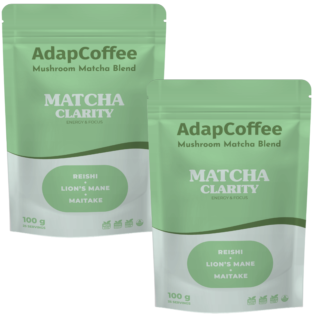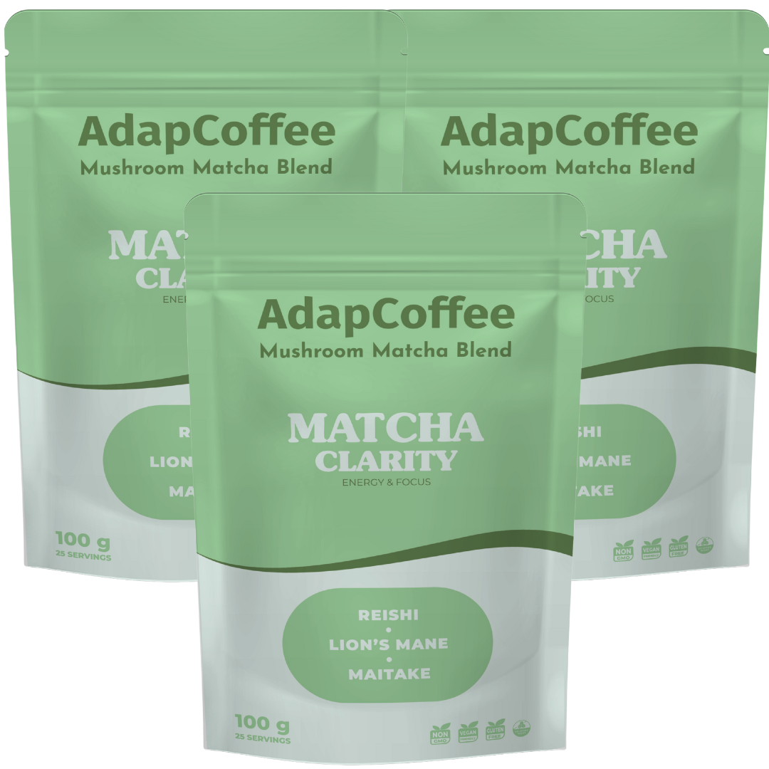 Thanks to its ceremonial matcha and adaptogenic mushroom extracts, Matcha Clarity by AdapCoffee: