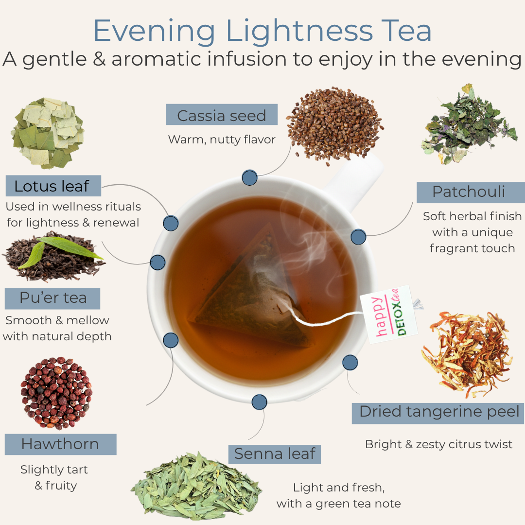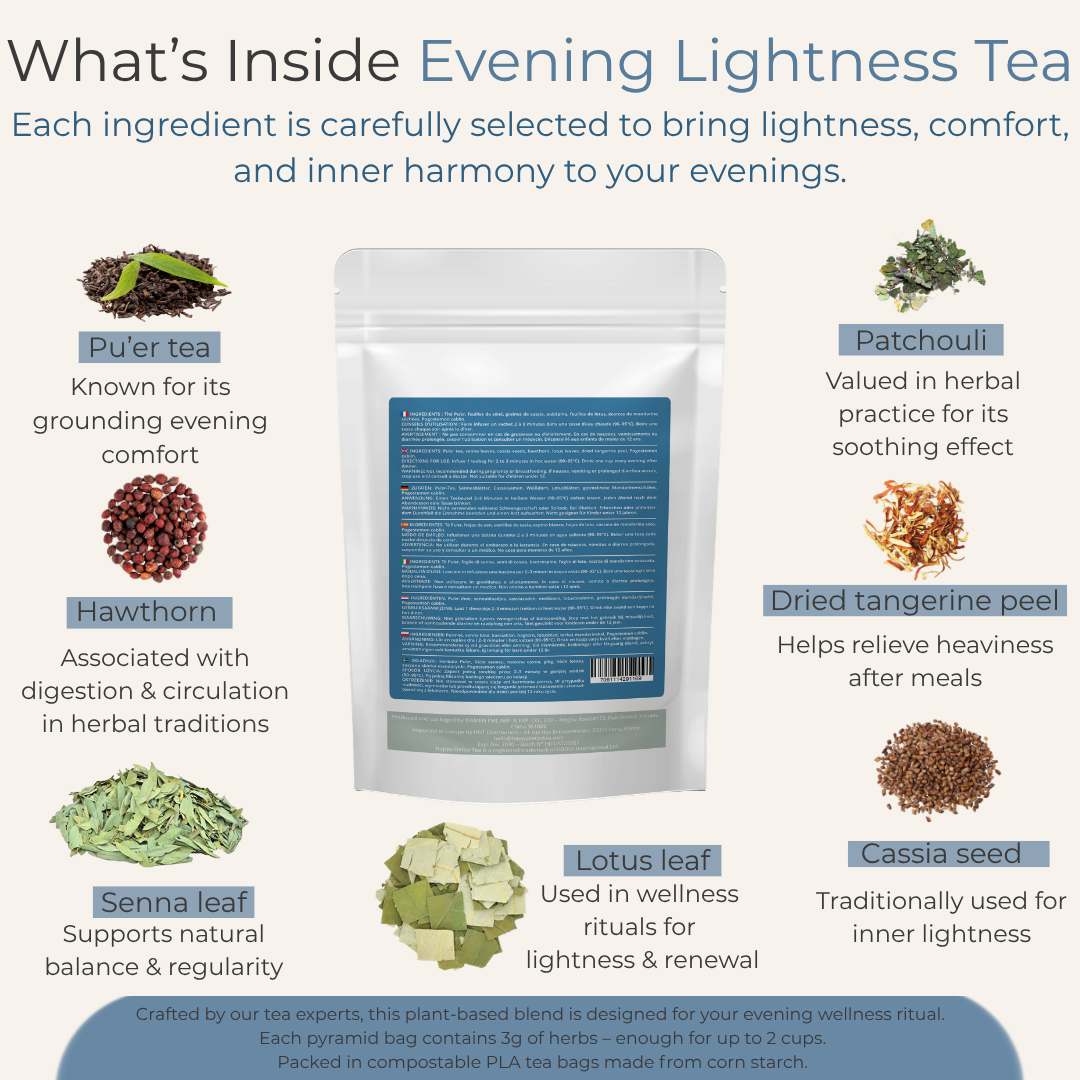 Chinese hawthorn - Chinese root - Orange peel - Senna - Lotus leaves - Patchouli - Pu’er tea