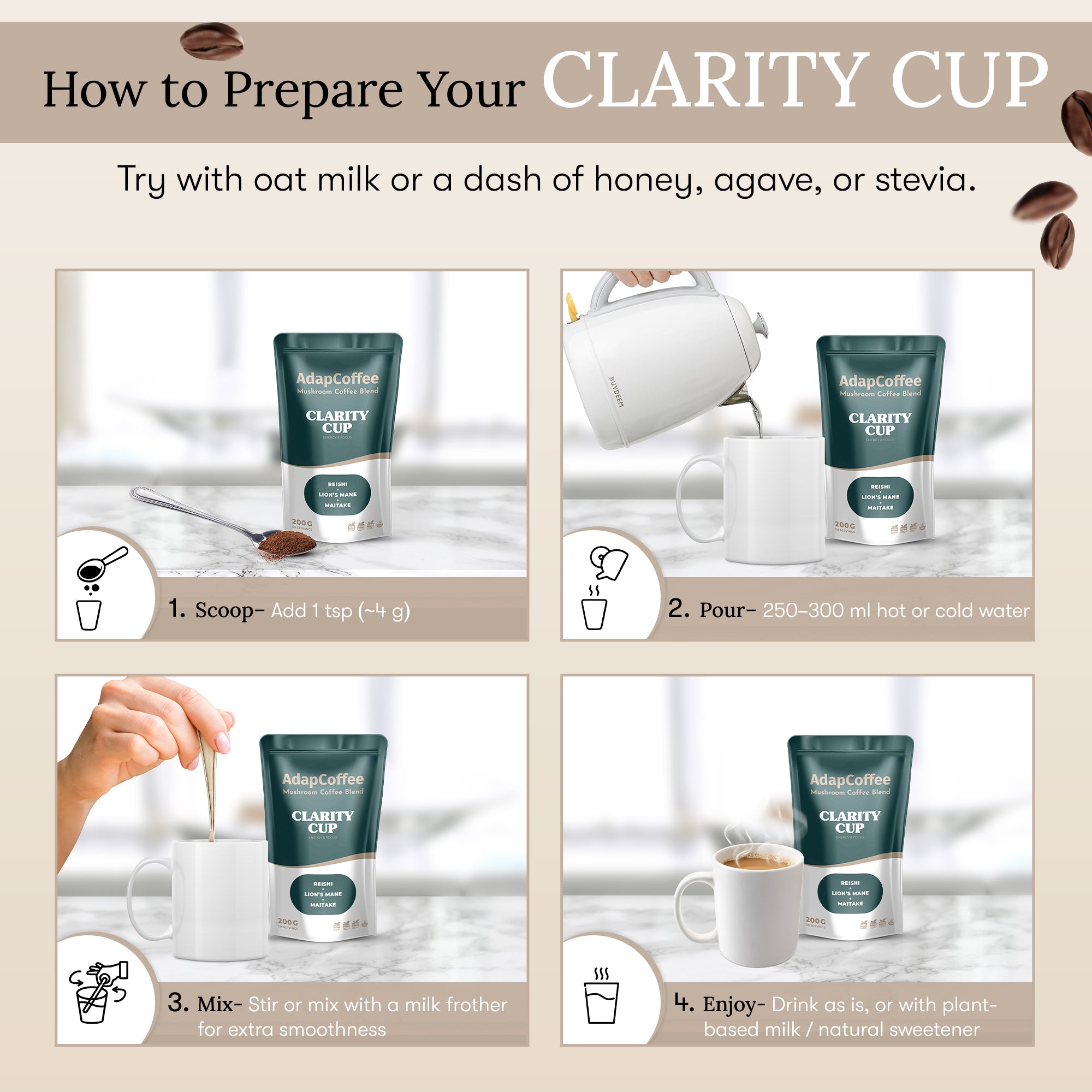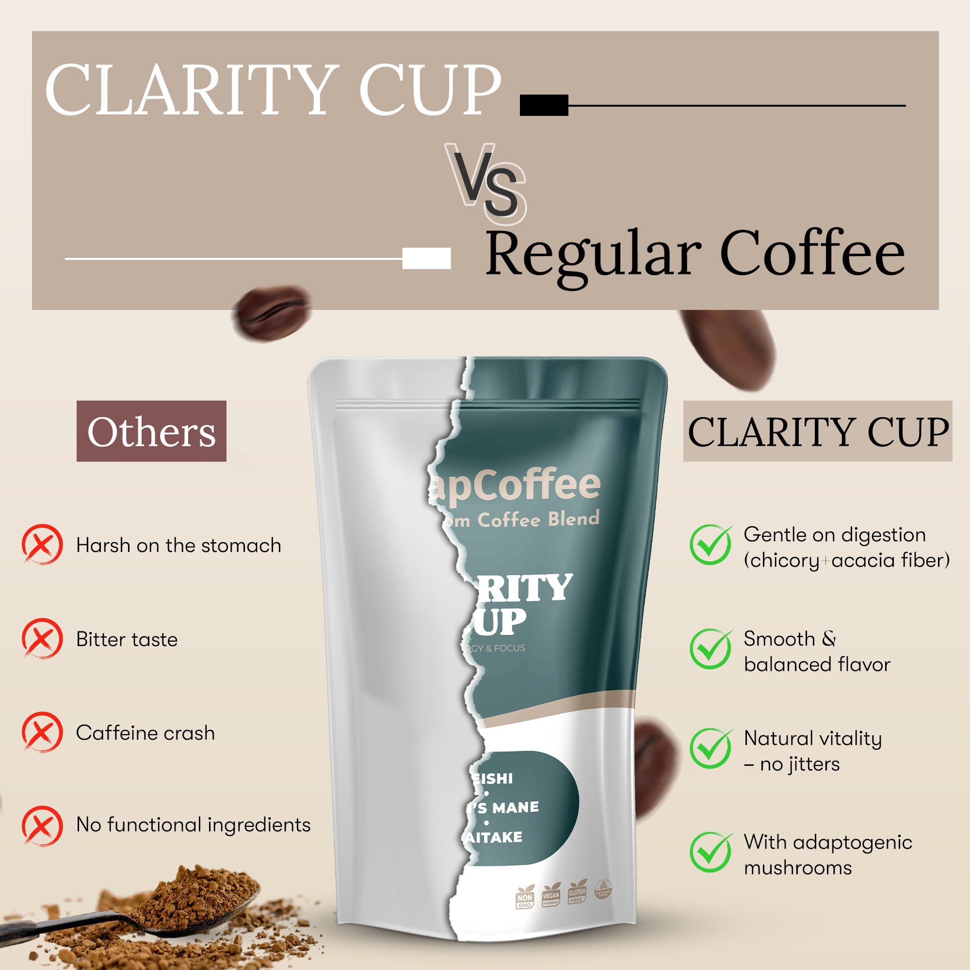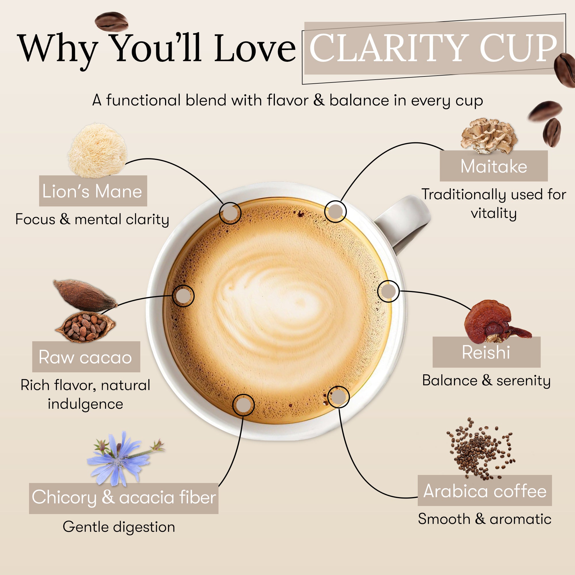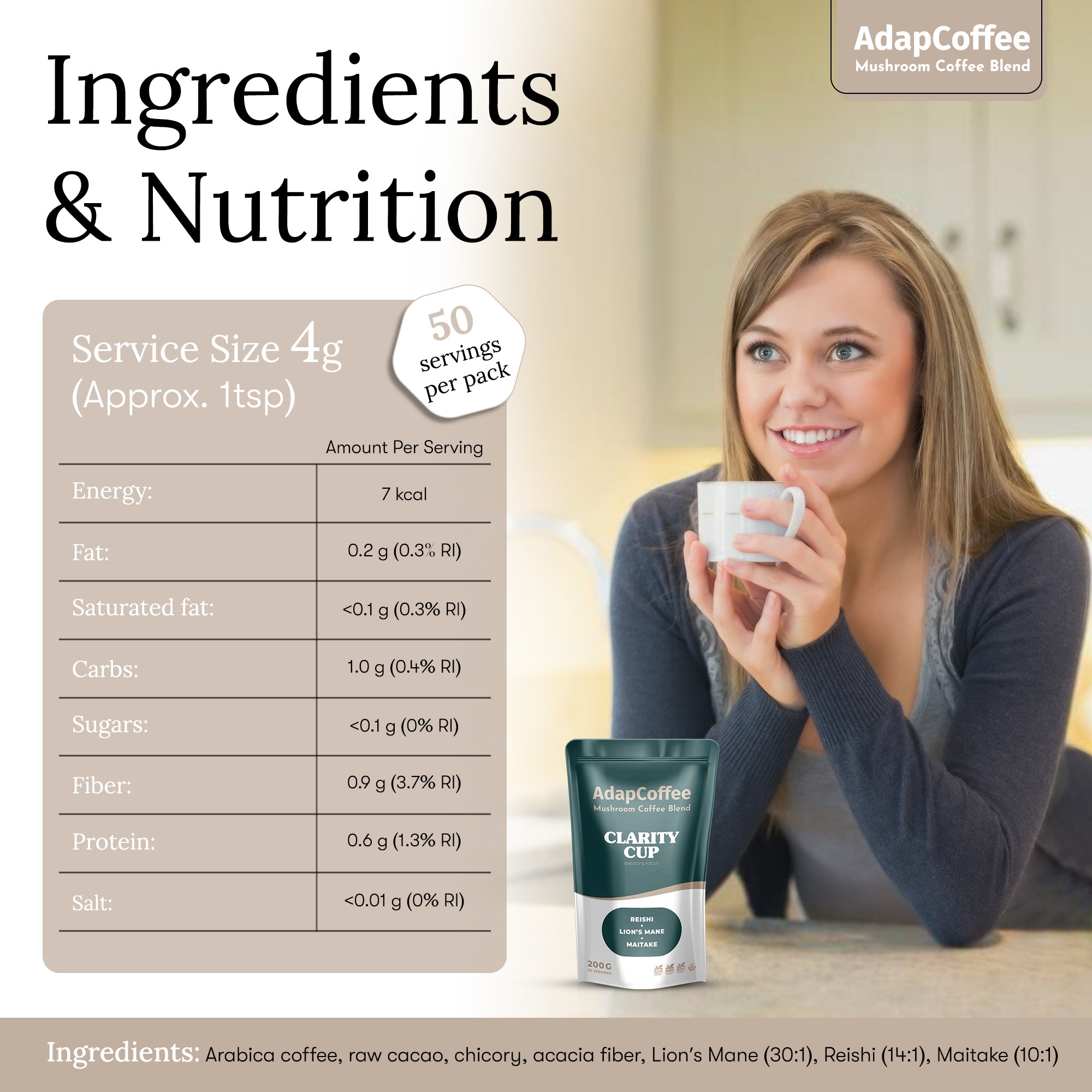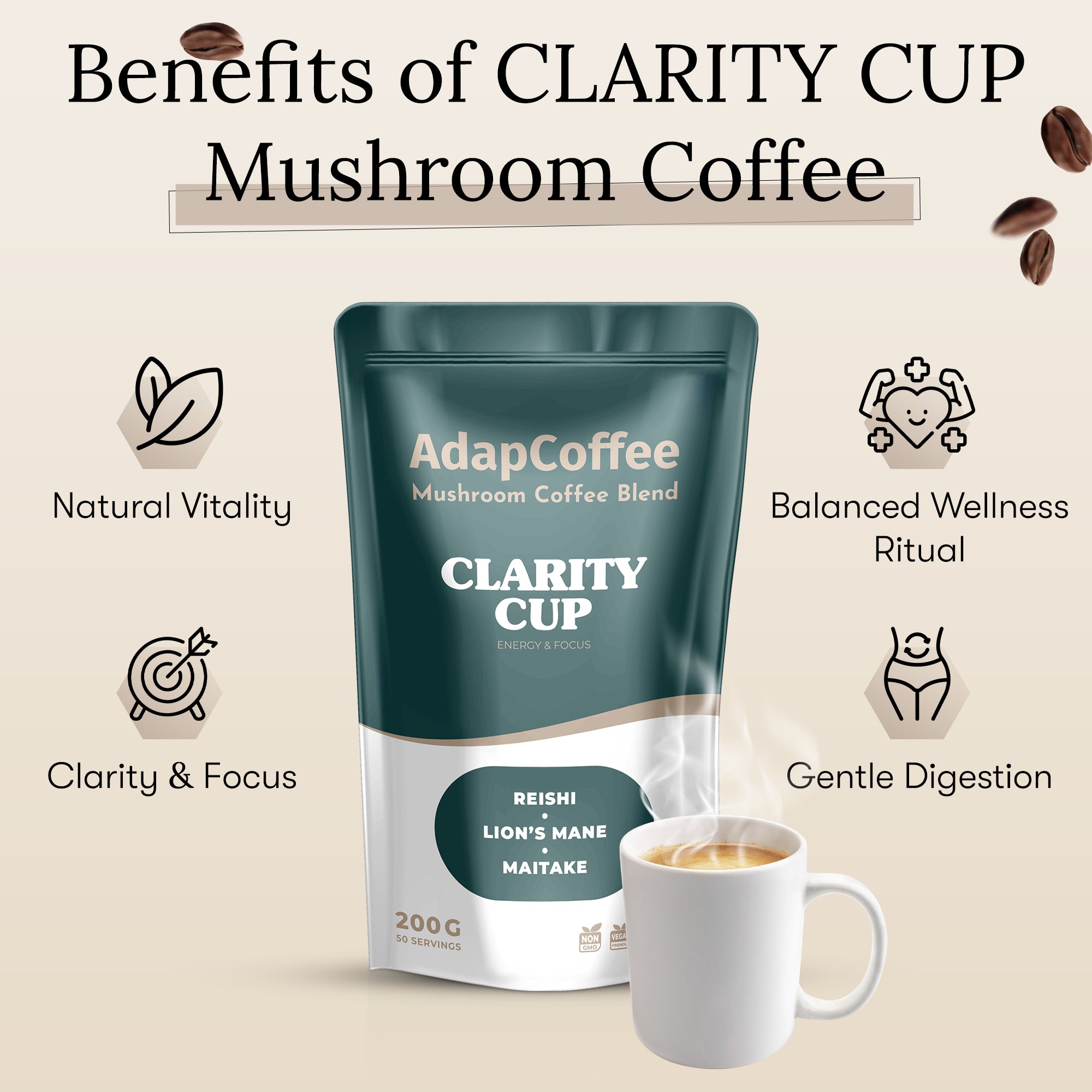 Thanks to its adaptogenic mushroom extracts and natural ingredients, Clarity Cup from AdapCoffee: