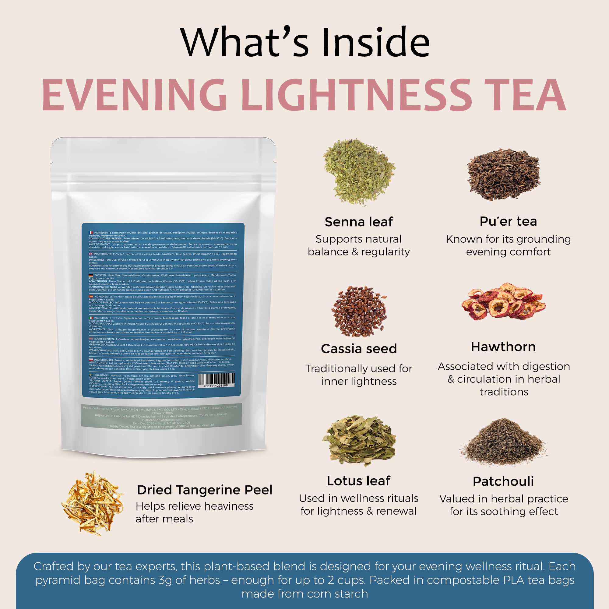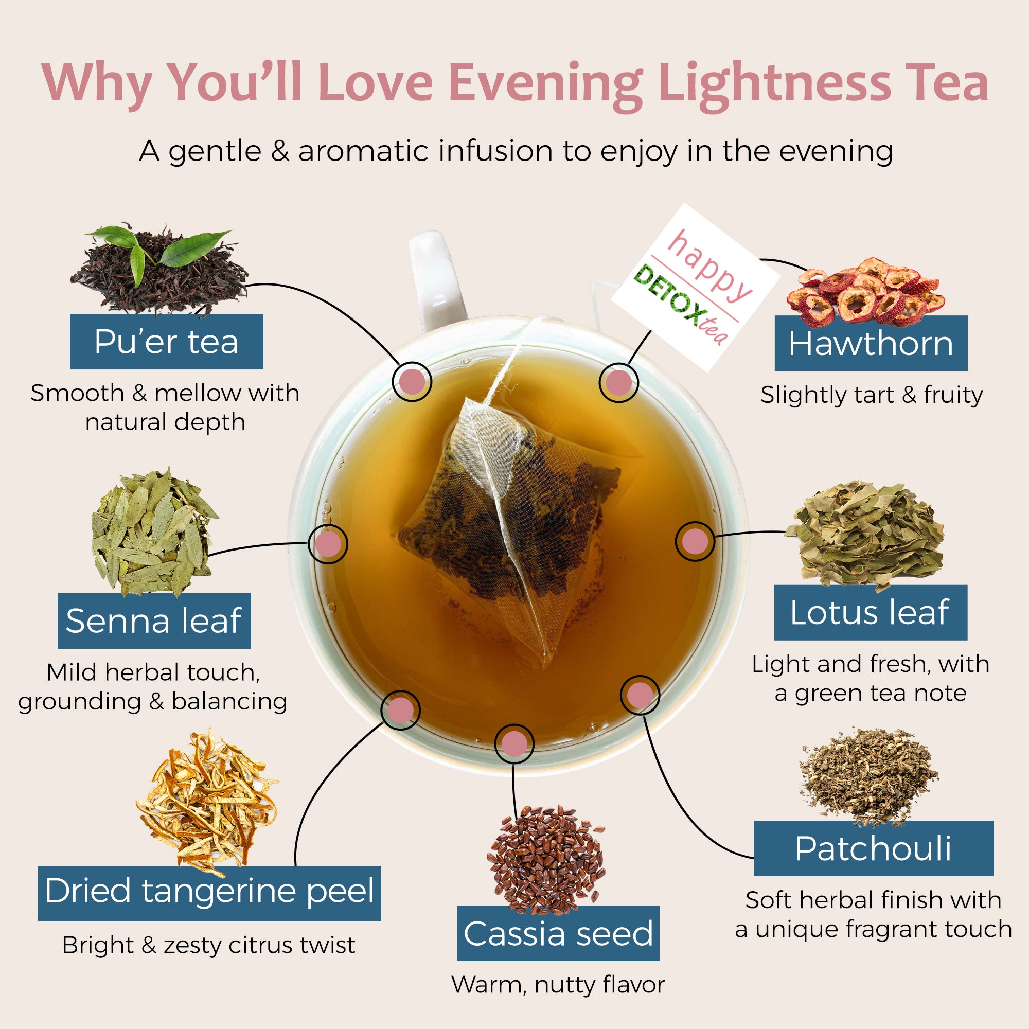 Chinese hawthorn - Chinese root - Orange peel - Senna - Lotus leaves - Patchouli - Pu’er tea